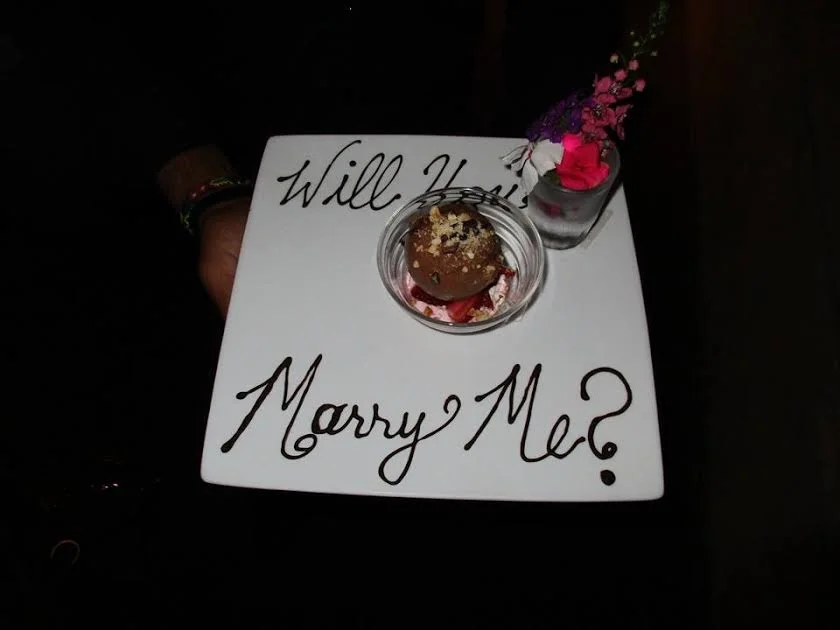 Not thirty seconds later, the server brought out the “cake” for Matt. We all started singing “Happy Birthday,” and I was in full out music mode thinking, “Wow, nobody was even CLOSE to choosing the same key…” when the server started putting the “cake” in front of me. I didn’t look at it, but instead said “No, no, no! It’s not for me! The birthday boy is over there!” Meanwhile, the birthday singing was tapering off…and Aaron stood up…and I looked at the plate. On the plate was “Will you marry me?” written in chocolate, along with a gorgeous wooden ring box, flowers, and ice cream. (I still have no idea what happened to the ice cream. Did anyone eat it? Was it good? Someone let me know.)**