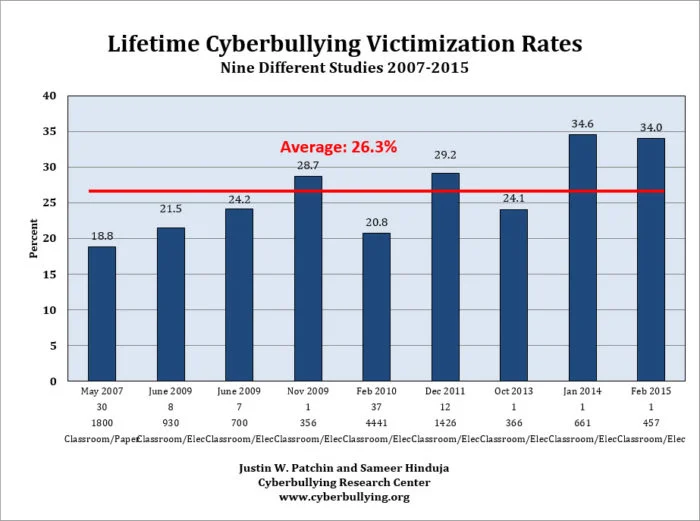 Research conducted at middle and high schools shows that an average of 26% of teenagers have been victims of cyberbullying over the last 9 years.