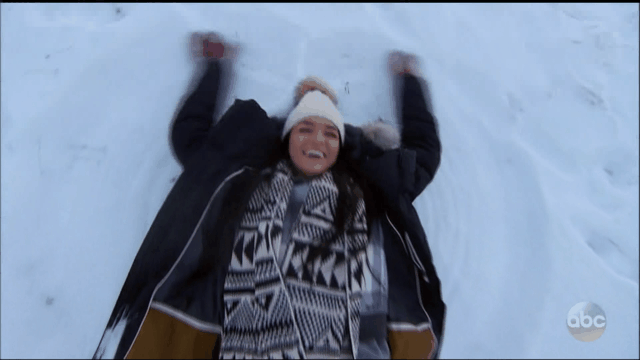The opening scene for this episode is HANDS DOWN my favorite 60 seconds of television that this show has ever produced, followed very closely by the swimming pigs scene in Hot Ben’s season, with the outtakes of JoJo trying to kill a wasp– again from Hot Ben’s season– in third place.Remember how last episode was all about Raven’s Fantasy Suite date, particularly the great mystery of whether or not Nick would give her her very first Big O? Well, I think it’s safe to assume he did, because this is a direct quote from Raven:”Nick is VERY good at what he does. I am really satisfied today.”As soon as she said that, I chugged my full glass of wine, which could explain why my husband and I went through nearly two bottles last night and I’m not feeling so hot this morning.Raven wraps herself in a fleece blanket she was wearing in the style of a post-coital bedsheet shawl and lets Nick burrow himself into her bosom upside down. It was among the strangest nuzzling styles I’ve ever seen, but to each his own.After they part ways, and because she can now see the world in a whole new light after her…don’t make me say it, Raven starts skipping around town to a song that repeated “like a daisy” over and over. I’ve spend the last 15 minutes searching for it, and I’m pretty sure it was a version of this children’s ballet song:She pets dogs, gives strangers high fives, goes sledding down a hill, makes snow angels, and exudes jovial youth as she basks in the glory of her satisfaction. It. Is. Hilarious. The entertainment factor was so high that I think my husband even started enjoying this show for once.While Raven frolics around town as a new woman, Nick wastes no time meeting up with his next bedmate: Rachel. Producers bought Rachel, Raven, and Vanessa matching hats in different colors. Raven’s was white, Rachel’s was red, and Vanessa’s was black. Anyone else notice that?Anyway, Rachel is as bubbly as we’ve ever seen her, even during the worst date activity of all time: Cross country skiing. I’ve cross country skied and let me tell you– it’s the WORST. Rachel agrees with me, but keeps her happy face because love can overcome anything. Well, not anything. Not two other girls who your boyfriend loves more than he loves you. But it can overcome falling on your butt a lot while cross country skiing.Finally they arrive at their destination and get to take off their skis. It’s time to feed some reindeer! Fun! Rachel calls one of the reindeer Donner, but he looked more like a Blitzen to me. We may never know which one it really was.Rachel and Nick head inside what looked to be an outhouse, but luckily it was just a one room wooden “cabin” decked out with fire and tribal blankets, where they cuddled up to talk about how much they like each other. I was really hoping for some conversation that didn’t revolve around their relationship, a la Nick and Raven’s debate on steaming vs. ironing, but Rachel and Nick stay on script. They talk about being scared of rejection, throw out the word “reciprocity” even though half of the people who watch this show probably don’t know what that word means, and Rachel tells Nick she has walls up. Yawn.I will say I really liked how when Rachel told Nick that he is different from most other guys, he said “I might be white, but I’m still a minority!” LOL Nick, why’s it always gotta be about race?The Bashler and Bashlerette then hop on a sleigh that was pulled by Donner with no driver. Seemed a bit unsafe if you ask me.She asked him if he wants her to call him “St. Nick,” which gave me flashbacks to this good ole Bachelorette arrival:Sadly, Nick tells Rachel that, no, that would be weird…and it’s the beginning of the end. Apparently Nick is not into role play just like he’s not into choking. #vanillaThat night, since it’s -15 degrees outside, Rachel naturally decides to wear a crop top. Nick wears something that looks like a mock turtleneck from certain angles, but I think it was just a really, really, really high V neck.After a few more minutes of talking about being scared, Rachel tells Nick she’s falling in love with him. He responds with “Rachel, I’m falling for you 100%. That’s easy to say. How ’bout that?”And with that, he hands her the Fantasy Suite date card, and they scurry off to make out on the bed. Rachel tells the camera that “we’re going to go so much deeper than we’ve gone before,” which is the point when I open the second bottle of wine.If anyone had any doubts about Rachel being an awesome Bachelorette, I hope your minds were put at ease when we got to see her making breakfast in a penguin onesie the next morning.There were just too many good visuals this episode to not share them with you all in .gif form.Rachel is so confident that she’s going to meet Nick’s family that I almost forget she doesn’t have a shot of winning this show. Poor thing. But not poor thing because she’s about to have 25 guys pining after her while she makes millions on endorsements. Who needs to be a lawyer when you can make $15,000 just for showing up at a bar?Next up: Vanessa.Traditionally, the Bachelor puts his #1 girl on the last Fantasy Suite date so that she has *fewer* trust issues after they get engaged and inevitably fight about things that happen on the show. It’s bad to have sex with a guy who was just hooking up with two other women, but it’s WORSE to have sex with a guy you love, only for him to go have sex with two other women right after making you feel special.I mean, neither is best case scenario, but it’s the price you pay for getting love and fame all at the same time.Nick takes Vanessa to an ice hole and tells her they’re going to jump in. I, too, have jumped in an ice hole in -15 degree weather. It was actually right after I spent a week cross country skiing and dogsledding. I feel very in tune with the things happening in this episode. Anyway, if I had to ch