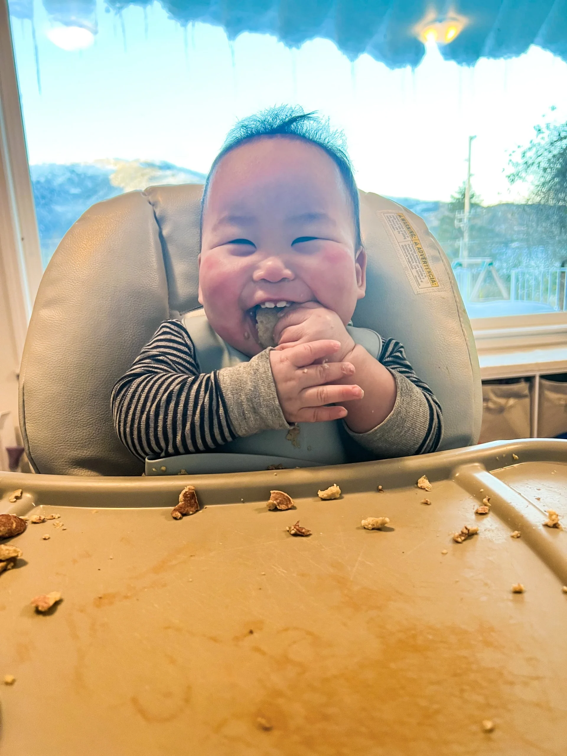 The kids tested negative yesterday, though, which marked their ability to go back to school! They’d never tested positive, but with my positive result, I highly doubt their first tests were accurate. Symptom-wise, we’re all 100% better! Warren was the worst of us, but he’s back to his old self. I’ve been working a lot with him in the last few days on non-pureed solids, which has been fun. Introducing solids is always a bit scary for me, but it’s always SO much easier once they can eat whatever we’re having for dinner. So we’re starting small with beans, eggs, pancakes, super soft cooked veggies, bread for gnawing, cottage cheese, strips of cheese, avocado, banana– that kind of thing. He’s doing fantastic!